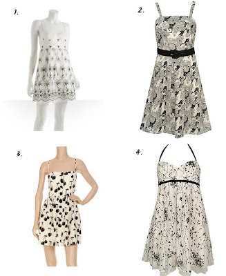 1. Tocca Cream Floral Silk Dress, $213. 2. Faith Flower Dress, $22.80. 3. Jill Stuart Lindsay Cherry Print Dress, $325.50. 4. Monochromatic Halter Dress, $29.80.