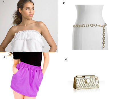 1. Milly Ruffled Silk Top, $172. 2. Michael Kors Gold Logo Engraved Chain Belt, $48. 3. Polyester Micro-Fiber Tulip Skirt, $28. 4. Felix Rey Gold Quilted Gabby Clutch, $180.