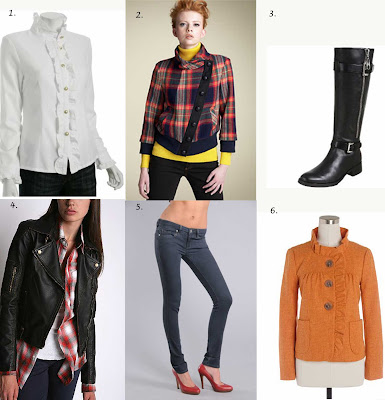 1. Priorities Ruffle Blouse, $64. 2. L.A.M.B. Sideways Plaid Blazer, $385. 3. BCBGirls Motorcycle Boot, $198. 4. Silence & Noise Motorcycle Jacket, $128. 5. Blank Skinny Classique Jeans in Grey, $78. 6. J. Crew Fiona Herringbone Jacket, $150.