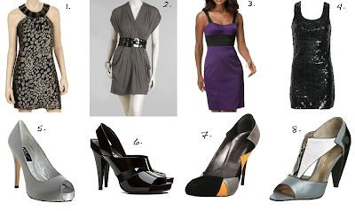 1. Forever 21 Cheetah Burnout Dress, $42. 2. Arden B Belted Pocket Dress, $98. 3.Democracy Stretch Satin Dress with Contrast Straps and Waist, $120. 4. Sequin Shift Dress, $33. 5. A.B.S Silver Satin Peep Toe Pumps, $72. 6. Kors Michael Kors Wicked Patent Slingback Sandals, $175. 7. Georgina Goodman Women’s Libby Platform Pump, $770. 8. Pour La Victoire Women’s Babette Pump, $105.