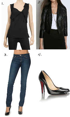 1. Max Studio Asymmetrical Shell, $128. 2. Silence & Noise Night Owl Open Jacket, $108. 3. J Brand Pencil Leg Jean in Dark Vintage, $168. 4. Christian Louboutin Decollette Leather Pumps, $575.