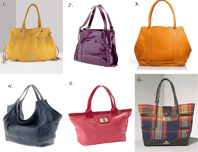 1. Elliott Lucca Large Leather Drawstring Tote, $298. 2. Jessica Simpson Socialista Tote, $108. 3. J.Crew Uptown Tote, $215. 4. Pink Studio Rain Tote, $75. 5. Marc by Marc Jacobs Tote-Ally Jacquard Tote, $228. 6. L.A.M.B. Women’s Edinburgh Clydebank Plaid Wool/Leather Tote, $475.