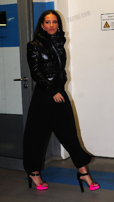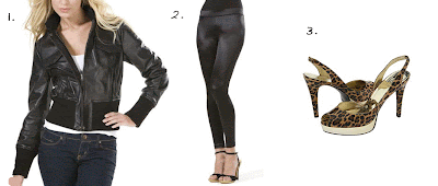 1. Express Leather Bomber Jacket, $248. 2. Express Shiny Knit Leggings, $39.50. 3. Guess by Marciano Debbilee Sandals, $81.