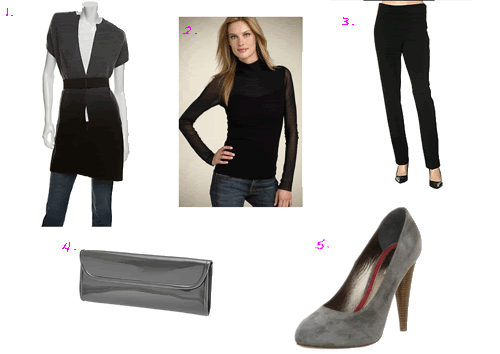 1. Vince Belted Ombre Sleeveless Sweater, $229. 2. Sweet Pea by Stacy Frati Mesh Turtleneck, $58. 3. ISDA & CO Ponte Slim Leg Pant, $136 4. Aldo Lioni Clutch, $16. 5. 7 for all mankind Women’s Olivia Platform Pump, $210.