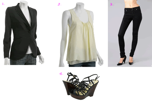 1. Development Black Stretch Jacket, $228. 2. Alexander Wang Butter Crepe Pleated Front Shell, $126. 3. Cheap Monday Tight Skinny Jeans in Black, $65. 4. Steve Madden Cayce Sandals, $77.
