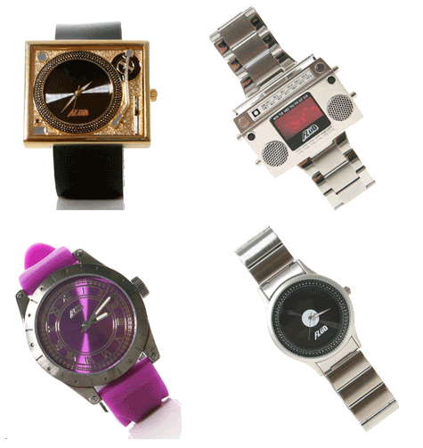 Top Row: Tableturns Leather Band Watch, $80; Boombox Watch, $90. Bottom Row: Big Ben Watch, $90; Flud 33 1/3 Steel Band Watch, $60.