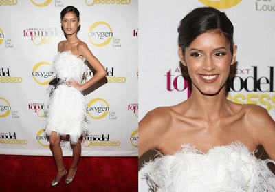 ANTM Cycle 8 winner Jaslene Gonzalez sparkles in this playful, strapless, feathered frock with silver peep-toe heels. Her gorgeous, natural-like makeup balances the dramatic dress beautifully–Hawt!
