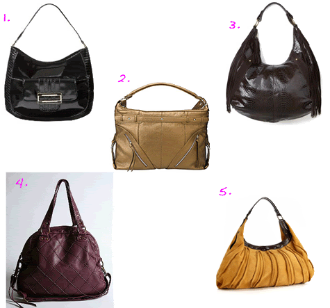 1. Anya Hindmarch for Target Small Python Hobo Bag, $25. 2. Nine West Metallic Slouchy Hobo, $60. 3. Express Genuine Suede Fringe Hobo, $79.50 4. Deux Lux Doublecross Bag, $68. 5. Kenneth Cole Aim to Pleats Bag, $104.