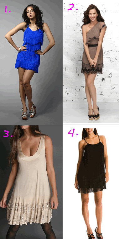 1. Royal Blue Flapper Dress, $72. 2. French Connection Beaded One Shoulder Flapper Dress, $120. 3. Silence & Noise Knit Bead Flapper Dress, $55. 4. Armani Exchange Fringe Mini Dress, $79.
