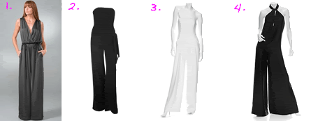1. Robert Rodriguez V-Neck Jumpsuit, $363. 2. Arden B Knit Tube Jumpsuit, $68. 3. Black Halo Strapless Stretch Jumpsuit, $450. 4. Stella McCartney Twill Halter Jumpsuit, $995.