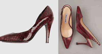 Left to Right: Gianna Meliani Maroon Snakeskin Pump, $154; Manolo Blahnik Slingback Snakeskin Pump, $865.Good luck!