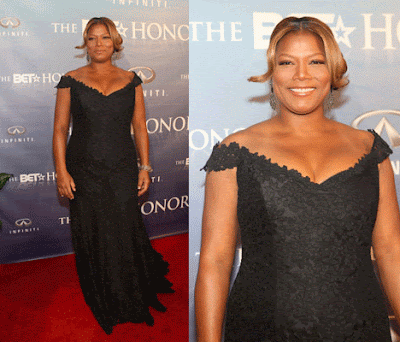 Queen Latifah went for sweet and simple in an off the shoulder black embroidered dress…