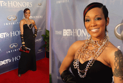 Singer Monica also went for black, accenting a strapless number with an assortment of necklaces, bracelets, and dominatrix type leather gloves…