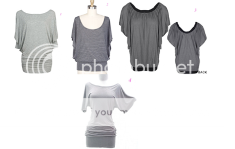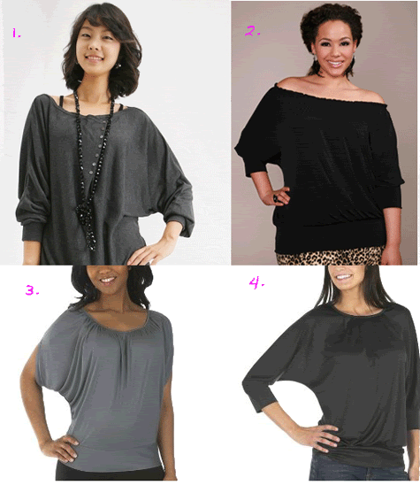 1. Dolman Sleeve Henley Tunic, $22. 2. Long Sleeved Knit Peasant Top, $38. 3. Mossimo Dolman, $12. 4. Long Sleeve Pleated Slinky Tunic, $17.