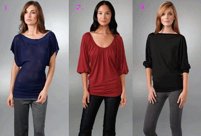 1. Bop Basics, Dolman Top, $45. 2. Lauren Conrad, Milley Top, $120. 3.Haute Hippe, Long Sleeve Modal Jersey Top, $87.