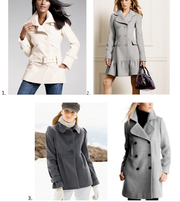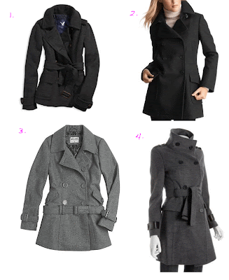 1. AE Belted Pea Coat, $50 2. GAP Long Wool Blend Pea Coat, $100. 3. Kelsey Belted Pea Coat, $60. 4. Marc New York Double Breasted Cashmere, $261.