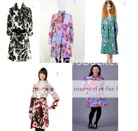 1. Foliage Silhouette Coat, $40. 2. Collage Boutique Floral knee length coat, $95. 3. Pat Field Floral Coat, $100. 4. Susan Lucci Floral Print Trench, $110. 5. Custo Barcelona double button coat, $207.