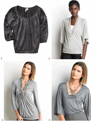 1.Ada Cinched Tunic, $15.80. 2. The Artist’s Tee, $35. 3. Draped Colorblock Top, $19. 4. Victoria Boat Neck Tunic, $22.