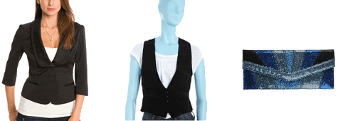 Left to Right: Guess Diamond Blazer, $90. Twelfth Street by Cynthia Vincent Waistcoat, $69. Forever 21 Glitter Clutch, $17.