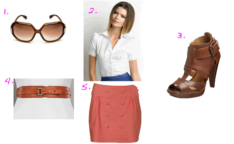 1. Marc Jacobs Brown Square Sunglasses, $98. 2. Banana Republic Stretch Cotton Blouse, $59. 3. Steve Madden Dionne Sandal, $113. 4. Linea Pelle Women’s Leather Belt, $113. 5. Charlotte Russe Twill Salmon Skirt, $23.