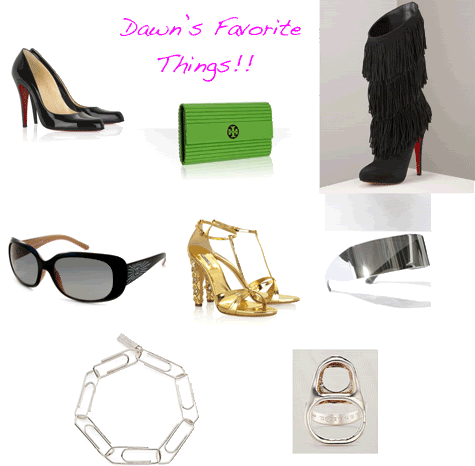 She says, “I never go anywhere without my Louis Vuitton platform shoes from their Fall collection, my Martin Margiela spring ’09 sunglasses (they look like ski glasses…they’re so Star Trek!), my Tina Turner fringe Louboutin boots (I feel like I wanna go dancing when I wear them!), my Miu Miu gold sandals with crystal nuggets in the heel, my limited edition Chanel round sunglasses, my black classic Christian Louboutins (every girl should have them), my Tory Burch green purse, and my Margiela bottle cap ring and paper clip bracelet.”