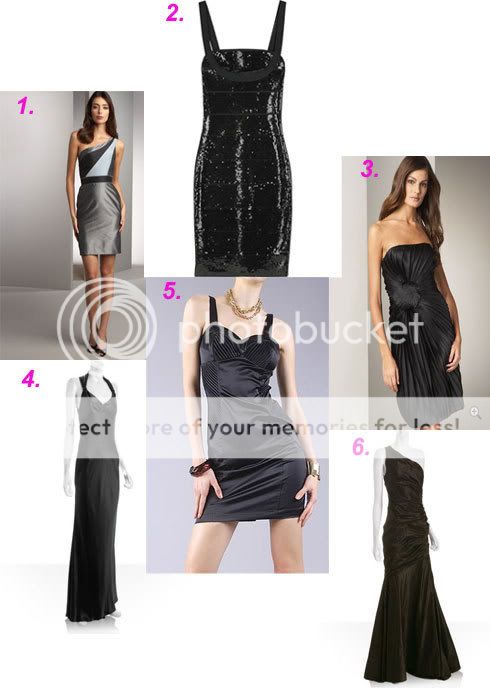 1. Abaete Carolyn Dress, $425 2. Hervé Léger Paiellette Covered Bandage Dress, $2,070 3. Badgley Mischka Pleated Dress, $695 4. A.B.S. Sateen V-Neck Gown, $204 5. Satin Pleated Sweetheart Dress, $30 6. Vera Wang Chocolate Ruched Taffeta One Shoulder Dress, $768