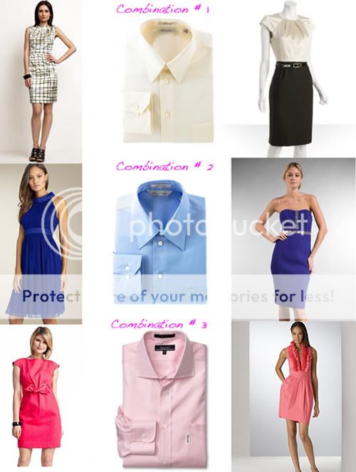 Combination 1: Banana Republic Graphic Sheath Dress, $150. Kenneth Cole New York Basic Dress Shirt, $45. A.B.S Garbardine all in one Dress, $162. Combination 2: Maggy London Cutaway Silk Dress, $138. Kenneth Cole New York Basic Dress Shirt, $45. Tracy Reese Couture Wool Embellished Dress in Blue Violet, $200. Combination 3: Taylor Jacquard Dress, $140. Faconnable Classic Fit Dress Shirt, $125. BCBG Max Azria Pleated Collar Dress, $220.