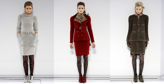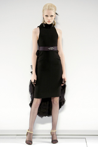 Karl Largerfeld stayed true to the Chanel legacy of nubby tweed suits and coats reinvented for the modern career woman. Each collection begs for a new take, and Karl offered interesting plays with proportion and silhouette, presenting jackets and dresses with long tales or trains and lovely lace patterned tights. I kept looking for a standout frock, and it came in a classic belted black shift with tulle. Unfortunately, for me, it was the sole standout: