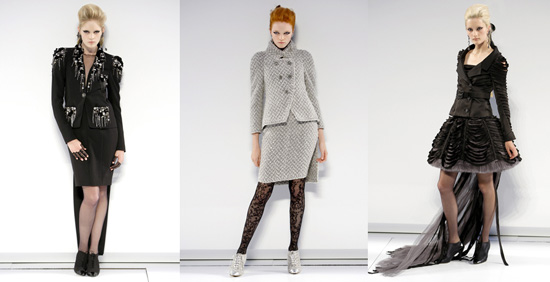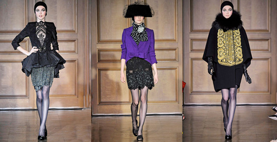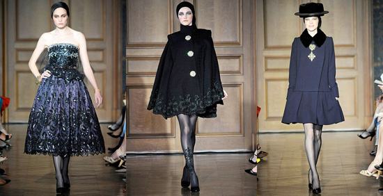 Christian Lacroix seemed to be mourning the current state of his company with his latest and perhaps final Haute Couture collection. Using funereal blacks and navy blues, Lacroix relinquished his typical opulence and fearless use of fabric, opting instead for decidedly more subdued colors and surface decoration. Bereavement aside, Lacroix’s fine hand and history of grandiosity were evident in the details–swing coats with gold embroidery and fur accoutrements, neck high lace tops worn under cinch waist skirted jackets, and strapless dresses peppered with crystals and beading: