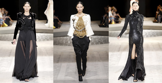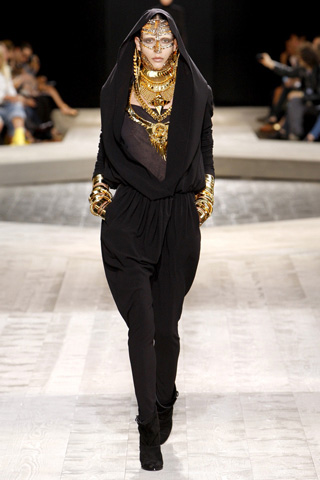 Riccardo Tisci also went for subdued colors like black or white, but amped up his collection with piles of statement jewels that seemed to draw inspiration from Moroccan royalty. Layered black outfits (replete with head scarves) were presented in contrast to gold face jewelry and stacks of chunky bangles. Intricate beading and embellishments contributed to a collection searingly rich in details, yet pedestrian enough to be worn by celebrity trendsetters: