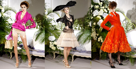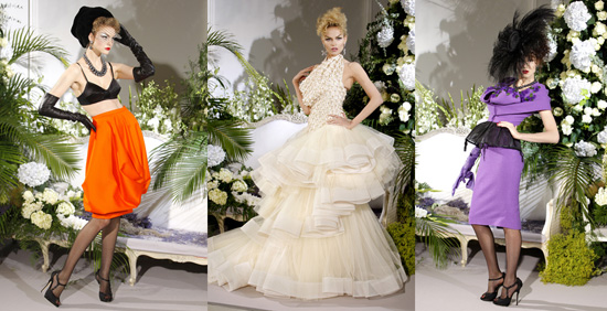 In high contrast to Chanel, Lacroix, and Givenchy, Dior went above and beyond blacks, grays, and whites to offer punches of bright pink, orange, and purple. On top of the onslaught of technicolor, Galliano continued to push the envelope with models shown in various states of undress, wearing bras with full skirts, jackets with girdles worn under sheer skirts, and slips with dresses. Exposed underpinnings aside, Galliano managed to harken back to Dior’s 1950’s cinched waist New Look while also offering silhouettes that would appeal to the modern well heeled fashionista. This collection made Haute Couture interesting and droolworthy in a way the others failed to do: