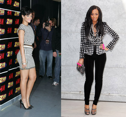 Rihanna wears an all gingham mini dress with pointy toed pumps, while Solange wears the print as a wild card jacket over all black…