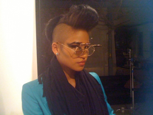 Seems she has combed her alluring shaved coiffe into a pompadour, and added a pair of spectacles for a quirky, fashion forward steeze.