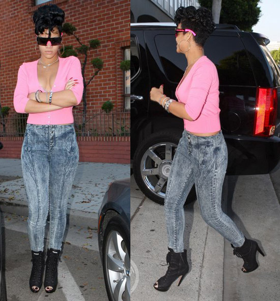 Rihanna dug into her 80’s wardrobe recently, donning a pair of acid wash jeans with a bright pink cardigan and neon sunglasses: