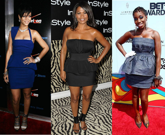 This skirted look mixes flirt with femininity, flattering most shapes in strapless or asymmetric styles. Rock a peplum piece in blue like Rihanna or Estelle, or go for a more subdued look a la Nia Long in black: