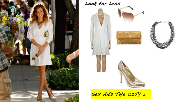 She wore a simple white v-neck dress, gold sequin pumps, and a gold clutch to film a scene with love interest Mr. Big. If you’re ready to get Carried away, get her look for less with these picks: