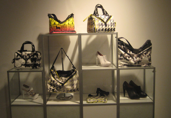 Gwen kept the color going in bags and shoes with neon totes, colorful platforms, and razor sharp stilettos.