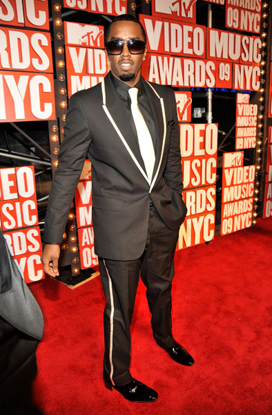 Dapper Diddy stunted in a black suit with white piping, fleshed out with a black shirt and white tie. Guys, if you ever need suggestions on how to switch up your typical suit, look to Diddy. He looks simple, yet distinctly hot.