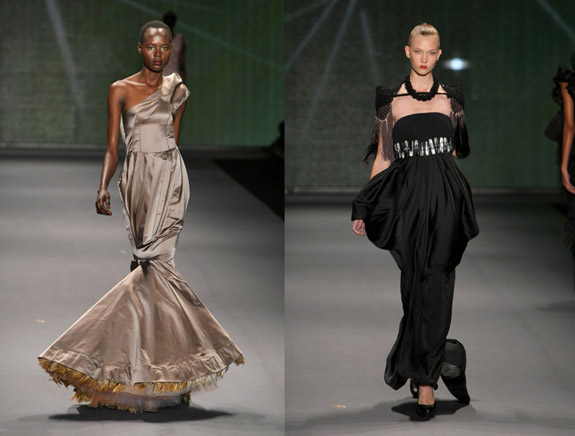 David Tale closed out the show in a big way with simple items that flaunted large details like tassled capes, shoulder applique’s, and beaded extended shoulder boleros: