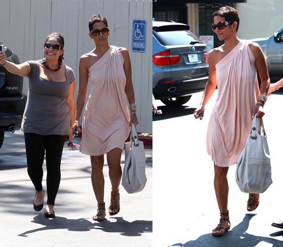 Halle Berry excited eager fans out in California, harkening back to her younger days with a cropped cut and one shoulder pale peach sundress. The simple outfit, set off by a roomy bag and gladiator sandals, is chic enough to look saucy yet still appropriate for a mature mom. Hot!