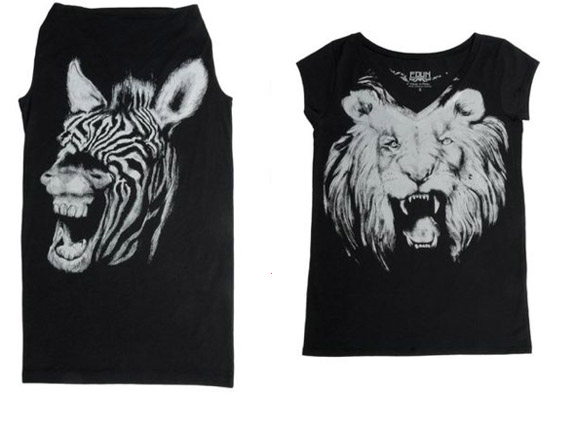 Susie says, “Dazed & Confused has partnered up with Edun to create these series of t-shirts/dresses, with the fashion team at Dazed working closely with illustrator Jo Ratcliffe to get the right ‘roar’ and level of ‘viciousness’ on the zebra, snake, lion and leopard heads. 15% of all proceeds will go to War Child, who are currently working on projects in Congo and the tees are 100% organic cotton and made in Peru.”