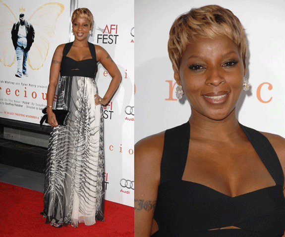 Fashion diva Mary J. Blige took the opposite route, rocking a floor grazing halter dress with aptly placed cut outs. Her understated diamond clip ons and black clutch allow her dress to shine on its own. Hot!