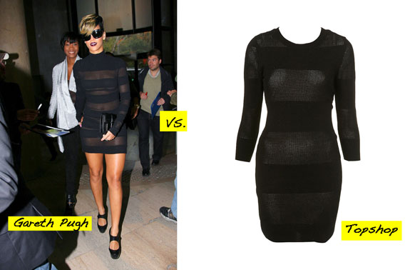 I’m sure that you, like all of us, kept up with the fashion that Rihanna brought during the fall/winter fashion week season. The talk of the town was this Gareth Pugh striped sheer number from his Spring/Summer 2010 collection. This obviously wouldn’t go unnoticed and “uncopied.” Enter Topshop’s Knitted Stripe Dress.