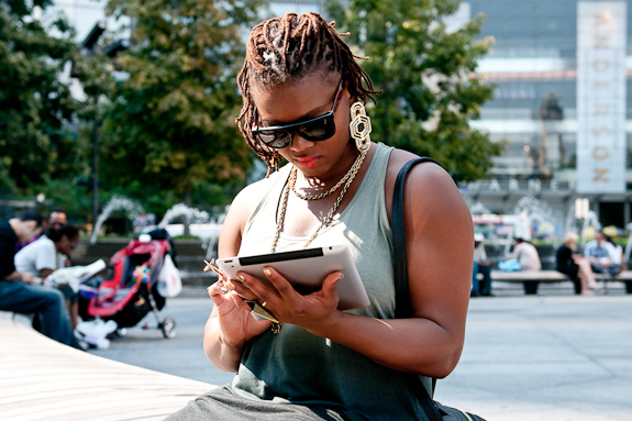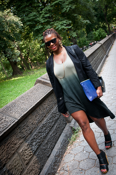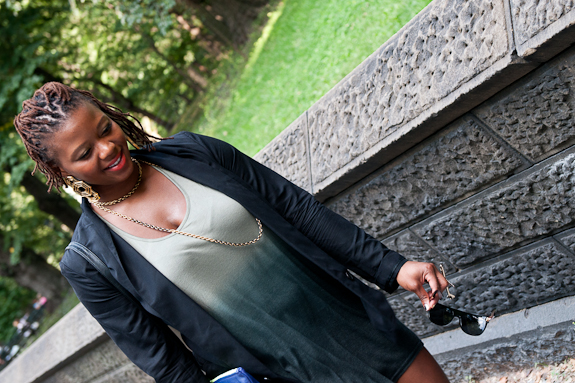 Outfit Deets: Dip Dye Tunic By Evil Twin, Melody Ehsani I’m Fly Ring, Melody Ehsani earrings, RVCA blazer, Coraline Messeca wedges, Mata Hari purse, all courtesy of www.Karmaloop.com. Super sunglasses, Blake Scotland 62 Clinton Street. Ipad Case, American Apparel.