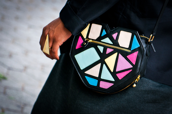 It has a cool asymmetrical hem that I. just.love. For the show itself, I covered my shoulders with the same RVCA blazer from yesterday, along opted for my comfy Coraline Messeca wedges and compact Mata Hari purse (I flipped it around to reveal its colorful side to add a pop):