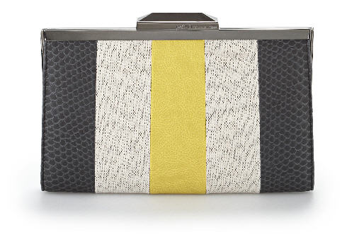 Her clutch features colorblocked stripes and snakeskin print for a touch of the exotic.