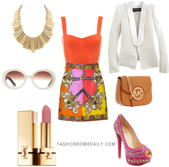 The print picks up on the color of the shoes, and has a similar fun and festive design. Keep the color going with an orange top, then tone it all down with a white blazer: