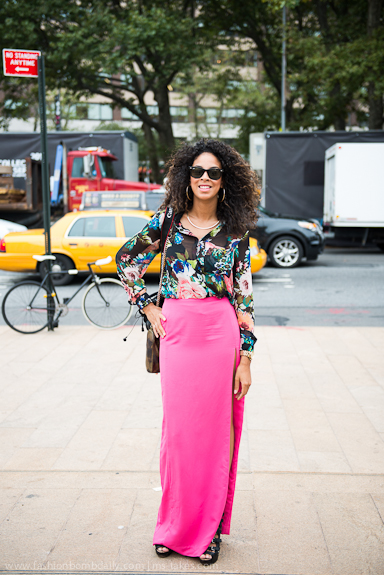 Kitty popped in a hot pink maxi skirt, accented by a floral blouse. Cute!