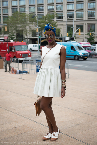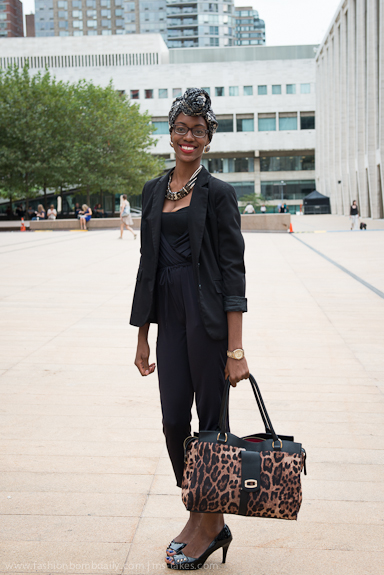 Fashion Week ladies love turbans! This diva let a printed headpiece accent an all black look.