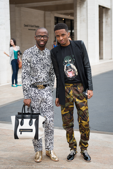 These friends sizzled in a patterned outfit, Céline bag, and YSL belt on the left and a Givenchy accented ensemble on the right. Fashion Week goers certainly cling to labels, but always add their own unique spins, as these two display.